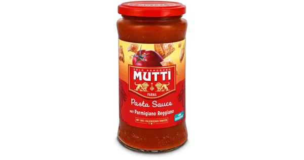 Tomatensauce mit Käse Parmigiano Reggiano (4%) – Zutaten: Gehackte Tomaten 60,6%, passierte „Rossoro”-Tomaten 20%, dreifach konzentriertes Tomatenmark 7,1 %, Karotten, Käse Parmigiano Reggiano...