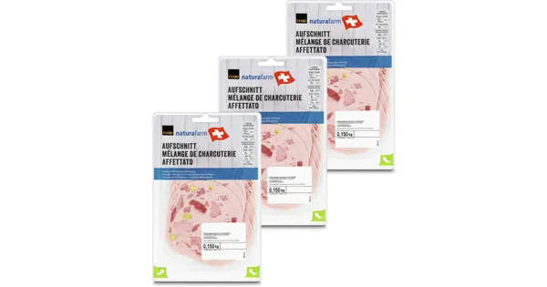 Fleischerzeugnis aus Schweine- und Rindfleisch – Zutaten: Schweinefleisch 46% (Schweiz), Eis, Speck (Schweiz), Schwarten, Karotten, Nitritpökelsalz (Kochsalz, Konservierungsstoff ), Rindfleisch 1%...