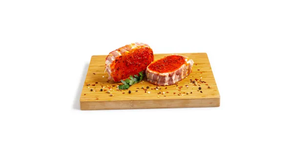 Schweinefleischzubereitung mit gepökeltem, geräuchertem Schweinefleischerzeugnis – Zutaten: Schweinefleisch 73% (Schweiz), Schweinefleischerzeugnis gepökelt, geräuchert 18% (Schweinefleisch [Schweiz], Nitritpökelsalz [Kochsalz, Konservierungsstoff [E 250]], Stabilisator [E 331], Zucker, Antioxidationsmittel [E 301]), Pfeffermarinade (pflanzliche Öle [Raps, Raps ganz gehärtet], Kochsalz jodiert, Pfeffer, Gewürze, Zucker, Hefeextrakt, Gewürzextrakt). Zubereitung: Nicht für den Rohverzehr geeignet. Zutaten: Schweinefleisch 73% (Schweiz), Schweinefleischerzeugnis gepökelt, geräuchert 18% (Schweinefleisch [Schweiz], Nitritpökelsalz [Kochsalz, Konservierungsstoff [E 250]], Stabilisator [E 331], Zucker, Antioxidationsmittel [E 301]), Pfeffermarinade (pflanzliche Öle [Raps, Raps ganz gehärtet], Kochsalz jodiert, Pfeffer, Gewürze, Zucker, Hefeextrakt, Gewürzextrakt). Zubereitung: Nicht für den Rohverzehr geeignet.