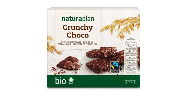 Getreideriegel mit Schokolade – Zutaten: HAFERFLOCKEN 29%, Invertzuckersirup*, Milchschokolade 13% (Rohrzucker*, Kakaobutter, VOLLMILCHPULVER [Schweiz], Kakaomasse, MAGERMILCHPULVER [Schweiz]), Kokosöl, Glucosesirup, Reis-Crispies (Vollreis, WEIZENPROTEIN, Mais, WEIZEN, SOJA, GERSTENMALZEXTRAKT), Cornflakes 6% (Mais, Rohrzucker, Kochsalz, Emulgator [E 322 aus SOJA]), HASELNÜSSE, Rohrzucker*, Kakaopulver 4%, Kochsalz jodiert. Kann Spuren von DINKEL, KHORASAN-WEIZEN, NÜSSEN, ROGGEN enthalten. Alle landwirtschaftlichen Zutaten stammen aus biologischer Produktion. >Fairtrade-Zucker* und Kakao mit Mengenausgleich, Kokosnuss. Gesamtanteil 44.1%. Mehr Info: Fairtrade-Code 10281369 www.fairtrademaxhavelaar.ch. Zutaten: HAFERFLOCKEN 29%, Invertzuckersirup*, Milchschokolade 13% (Rohrzucker*, Kakaobutter, VOLLMILCHPULVER [Schweiz], Kakaomasse, MAGERMILCHPULVER [Schweiz]), Kokosöl, Glucosesirup, Reis-Crispies (Vollreis, WEIZENPROTEIN, Mais, WEIZEN, SOJA, GERSTENMALZEXTRAKT), Cornflakes 6% (Mais, Rohrzucker, Kochsalz, Emulgator [E 322 aus SOJA]), HASELNÜSSE, Rohrzucker*, Kakaopulver 4%, Kochsalz jodiert. Kann Spuren von DINKEL, KHORASAN-WEIZEN, NÜSSEN, ROGGEN enthalten. Alle landwirtschaftlichen Zutaten stammen aus biologischer Produktion. >Fairtrade-Zucker* und Kakao mit Mengenausgleich, Kokosnuss. Gesamtanteil 44.1%. Mehr Info: Fairtrade-Code 10281369 www.fairtrademaxhavelaar.ch.