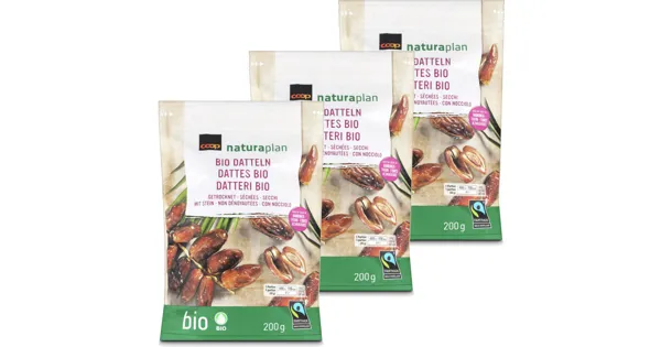 Datteln mit Stein, getrocknet Die Naturaplan Bio Fairtrade Datteln überzeugen mit ihrem süss-fruchtigen Geschmack und sind vielseitig einsetzbar, ob für Müesli, Gebäck oder als Snack. Sie stammen aus biologischem Anbau und tragen das Fairtrade-Label. Ohne zugesetzten Zucker sind sie eine natürliche Wahl für bewussten Genuss. – Zutaten: Bio Datteln (Herkunft: siehe Datierungsfeld). Datteln wurden von Fairtrade-Produzenten angebaut, nach Fairtrade-Standards zertifiziert und gehandelt. Gesamtanteil 100%. Mehr Info: www.fairtrade.net/ch. Zutaten: Bio Datteln (Herkunft: siehe Datierungsfeld). Datteln wurden von Fairtrade-Produzenten angebaut, nach Fairtrade-Standards zertifiziert und gehandelt. Gesamtanteil 100%. Mehr Info: www.fairtrade.net/ch.