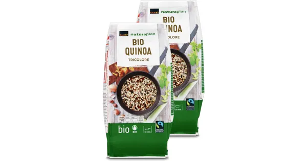 Quinoa Naturaplan Bio Fairtrade Quinoa Tricolore bietet eine nährstoffreiche Mischung aus weissem, rotem und schwarzem Quinoa, die vielseitig einsetzbar ist. Die hochwertige Bio-Qualität und die Fairtrade-Zertifizierung sorgen für ein gutes Gewissen beim Genuss. Dieses vegane Produkt eignet sich hervorragend als Beilage oder Grundlage für kreative Rezepte. – Zutaten: Bio Quinoa (Herkunft: siehe Datierungsfeld). Quinoa wurde von Fairtrade-Produzenten angebaut, nach Fairtrade-Standards zertifiziert und gehandelt. Gesamtanteil 100%. Mehr Info: Fairtrade-Code 1028114. www.fairtrademaxhavelaar.ch. Zutaten: Bio Quinoa (Herkunft: siehe Datierungsfeld). Quinoa wurde von Fairtrade-Produzenten angebaut, nach Fairtrade-Standards zertifiziert und gehandelt. Gesamtanteil 100%. Mehr Info: Fairtrade-Code 1028114. www.fairtrademaxhavelaar.ch.