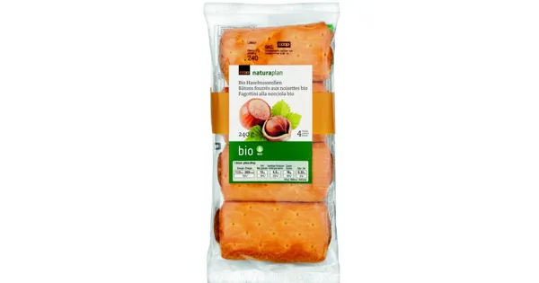 Hefegebäck mit 50% Haselnussfüllung – Zutaten: WEIZENMEHL (Weiss, Halbweiss), Zucker, Palmfett (nachhaltig)*, HASELNÜSSE 9%, SOJABOHNEN, Wasser, EIER, WEIZENSTÄRKE, Sonnenblumenöl, MAGERMILCHPULVER**, Hefe, Kochsalz jodiert, MOLKENPULVER**, WEIZENGLUTEN, Zitronenschalen, Zimt, VOLLMILCHPULVER**. Kann Spuren von BAUMNUSS, DINKEL, GERSTE, HAFER, KHORASAN-WEIZEN, MANDELN, ROGGEN, SESAM enthalten. Alle landwirtschaftlichen Zutaten stammen ausbiologischer Produktion. *nachhaltig, www.coop.ch/palmoel, **Schweiz. Zutaten: WEIZENMEHL (Weiss, Halbweiss), Zucker, Palmfett (nachhaltig)*, HASELNÜSSE 9%, SOJABOHNEN, Wasser, EIER, WEIZENSTÄRKE, Sonnenblumenöl, MAGERMILCHPULVER**, Hefe, Kochsalz jodiert, MOLKENPULVER**, WEIZENGLUTEN, Zitronenschalen, Zimt, VOLLMILCHPULVER**. Kann Spuren von BAUMNUSS, DINKEL, GERSTE, HAFER, KHORASAN-WEIZEN, MANDELN, ROGGEN, SESAM enthalten. Alle landwirtschaftlichen Zutaten stammen ausbiologischer Produktion. *nachhaltig, www.coop.ch/palmoel, **Schweiz.