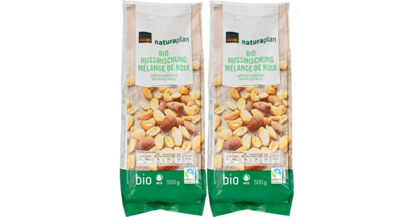Nussmischung geröstet, gesalzen Die Naturaplan Bio Nussmischung überzeugt durch sorgfältig ausgewählte Bio-Zutaten und bietet eine ausgewogene Mischung aus knackigen Nüssen. Das Produkt ist vegan und eignet sich ideal als natürlicher Snack für zwischendurch. Mit dem Fairtrade-Label unterstützt es einen nachhaltigeren Konsum. – Zutaten: MANDELN (A*), CASHEWNÜSSE 33% (B*), ERDNÜSSE (C*), Sonnenblumenöl High Oleic, Kochsalz. *Herkunft A-C: siehe Datierungsfeld Kann Spuren von BAUMNUSS, HASELNUSS, MACADAMIANUSS, PARANUSS, PECANNUSS, PISTAZIEN enthalten. Alle landwirtschaftlichen Zutaten stammen ausbiologischer Produktion. Zutaten: MANDELN (A*), CASHEWNÜSSE 33% (B*), ERDNÜSSE (C*), Sonnenblumenöl High Oleic, Kochsalz. *Herkunft A-C: siehe Datierungsfeld Kann Spuren von BAUMNUSS, HASELNUSS, MACADAMIANUSS, PARANUSS, PECANNUSS, PISTAZIEN enthalten. Alle landwirtschaftlichen Zutaten stammen ausbiologischer Produktion.