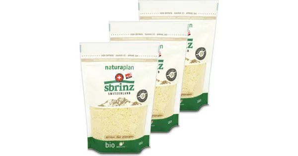 Vollfett-Extrahartkäse, mit Rohmilch hergestellt Der Naturaplan Bio Sbrinz Reibkäse überzeugt mit seiner hochwertigen Bio-Qualität und ist bereits perfekt gerieben, um vielseitig verwendet zu werden. Dank seinem unverkennbaren Aroma verleiht er Gerichten wie Pastas und Gratins eine besonders feine Note. Das Bio-Knospe-Label garantiert höchste Standards bei der Herstellung. – Zutaten: Bio MILCH (Schweiz), Kochsalz. Zutaten: Bio MILCH (Schweiz), Kochsalz.
