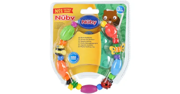 Bunte Beisskette Ausnahmsweise darf Ihr kleiner Schatz diesen Schmetterling, Marienkäfer und diese Biene in den Mund nehmen. Die Figuren haben verschiedene Oberflächen, die während des Zahnens das empfindliche Zahnfleisch massieren und sanften Druck darauf ausüben. Die Beiss- und Greifkette stimuliert den Lippen- und Mundbereich, wodurch eine gesunde orale Entwicklung gefördert wird. Dank seiner unterschiedlichen Formen und Farben fördert der Beissring die motorische Entwicklung Ihres Babys. Dieser Beissring von Nûby™ ist für Babys ab 3 Monaten geeignet.