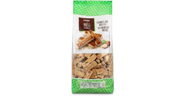 Dauerbackware – Zutaten: Weissmehl (WEIZEN), Zucker, HASELNÜSSE 24%, Kartoffelstärke, Rapsöl, Rapsöl ganz gehärtet, MAGERMILCHPULVER, GERSTENMALZEXTRAKT, Kochsalz, Backtriebmittel (E 503). Kann...