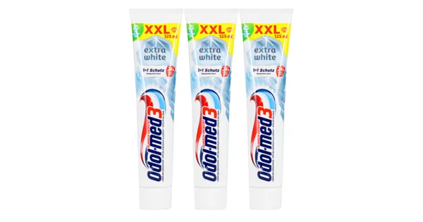 Zahnpasta Die klinisch getestete Odol-med3 Extra White Zahnpasta mit Mikro-Whiteningpartikeln reinigt und entfernt sanft Zahn-Verfärbungen für sichtbar weissere Zähne.* Die Zahnweiss-Schutz-Formel...