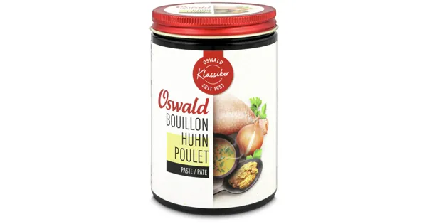 Hühnerbouillon Oswalds Hühnerbouillon Paste ist eine hervorragende Grundlage für Fleischgerichte und -saucen. Wer eine Stärkung braucht, geniesst sie als Trinkbouillon oder Suppe. Im heissen Wasser...