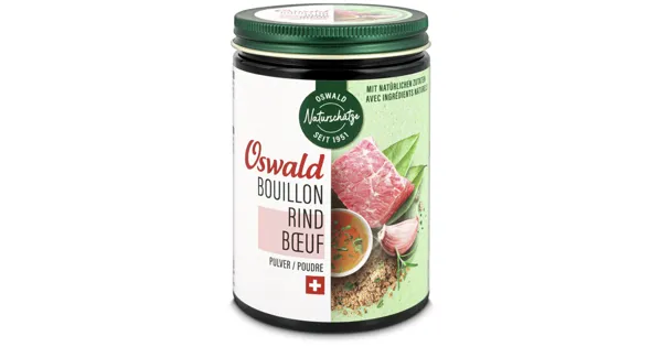 Rindsbouillon Oswald Naturschätze Rindsbouillon Pulver bietet einen authentischen und kräftigen Rindfleischgeschmack, ideal zur Verfeinerung von Suppen und Saucen. Die praktische Pulverform ermöglicht eine einfache Dosierung und spart Zeit in der Küche. Diese Bouillon ist perfekt für alle, die Wert auf schnellen und wohlschmeckenden Genuss legen. – Zutaten: Kochsalz¹, Maisstärke¹, Hefeextrakt, Maltodextrin, Zwiebelpulver¹, natürliches Aroma (gebratenes Rindfleisch, Kochsalz, gebrannter Zucker, Maltodextrin, Sonnenblumenöl), Rindfleischextrakt¹ 3%, Rapsöl, Gewürze¹ (Paprika, Knoblauch 0,3%, Rosmarin, weisser Pfeffer 0,2%, Liebstöckel, Lorbeer 0,1%), getrocknete Petersilie¹. ¹ natürliche Zutat. Zutaten: Kochsalz¹, Maisstärke¹, Hefeextrakt, Maltodextrin, Zwiebelpulver¹, natürliches Aroma (gebratenes Rindfleisch, Kochsalz, gebrannter Zucker, Maltodextrin, Sonnenblumenöl), Rindfleischextrakt¹ 3%, Rapsöl, Gewürze¹ (Paprika, Knoblauch 0,3%, Rosmarin, weisser Pfeffer 0,2%, Liebstöckel, Lorbeer 0,1%), getrocknete Petersilie¹. ¹ natürliche Zutat.
