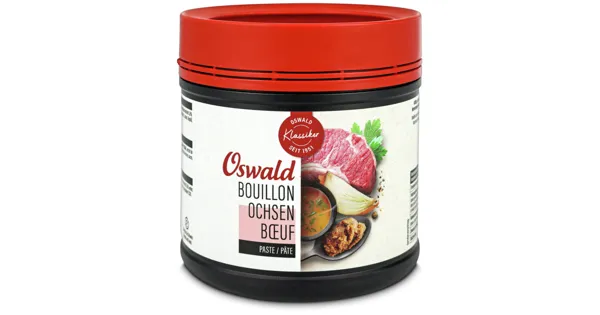 Ochsenbouillon Die Ochsenbouillon Paste von Oswald ist eine vollmundige Fleischbouillon mit kräftigem Rindfleischaroma und dezenter Petersilien-Einlage. Ideal als Trinkbouillon oder Basis für...