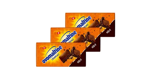 Dunkle Schweizer Schokolade mit Ovomaltine* – Zutaten: Kakaomasse, Zucker, 25% malzhaltiges Getränkepulver* Ovomaltine [GERSTENMALZEXTRAKT, kondensierte MAGERMILCH, kondensiertes MILCHSERUM, fettarmes Kakaopulver, Zucker, Fruktose, Mineralstoffe (Magnesiumcarbonat, Dicalciumphosphat), Rapsöl, Vitamine (A, E, C, Thiamin, Riboflavin, Niacin, B6, Folsäure, B12, Biotin, Pantothensäure), Speisesalz, Aroma Vanillin], Kakaobutter, VOLLMILCHPULVER, BUTTERREINFETT, Emulgator SOJALECITHIN. Kann enthalten: Mandeln, Haselnüsse. Zutaten: Kakaomasse, Zucker, 25% malzhaltiges Getränkepulver* Ovomaltine [GERSTENMALZEXTRAKT, kondensierte MAGERMILCH, kondensiertes MILCHSERUM, fettarmes Kakaopulver, Zucker, Fruktose, Mineralstoffe (Magnesiumcarbonat, Dicalciumphosphat), Rapsöl, Vitamine (A, E, C, Thiamin, Riboflavin, Niacin, B6, Folsäure, B12, Biotin, Pantothensäure), Speisesalz, Aroma Vanillin], Kakaobutter, VOLLMILCHPULVER, BUTTERREINFETT, Emulgator SOJALECITHIN. Kann enthalten: Mandeln, Haselnüsse.