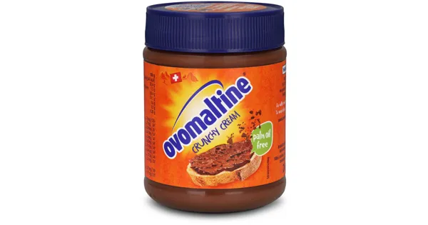 Brotaufstrich mit malzhaltigem Getränkepulver Ovomaltine – Zutaten: Malzhaltiges Getränkepulver Ovomaltine 33% (GERSTENMALZEXTRAKT 17%, kondensierte MAGERMILCH, kondensiertes MILCHSERUM, fettarmes Kakaopulver¹, Zucker, Fruktose, Mineralstoffe (Magnesiumcarbonat, Dicalciumphosphat), Rapsöl 0.2%, Vitamine (E, C, Thiamin, Riboflavin, Niacin, B6, Folsäure, B12, Biotin, Pantothensäure), Speisesalz, Aroma (Vanillin)), Zucker, Schweizer Pflanzenöle 29% (Rapsöl, Rapsöl ganz gehärtet), HASELNÜSSE, Emulgatoren (Lecithine, Mono- und Diglyceride von Speisefettsäuren), Mineralstoff (Dicalciumphosphat), fettarmes Kakaopulver¹, Antioxidationsmittel (L-Ascorbylpalmitat, Alpha-Tocopherol), Aroma (Vanillin). ¹Rainforest Alliance-zertifiziert. Mehr Infos: ra.org. Zutaten: Malzhaltiges Getränkepulver Ovomaltine 33% (GERSTENMALZEXTRAKT 17%, kondensierte MAGERMILCH, kondensiertes MILCHSERUM, fettarmes Kakaopulver¹, Zucker, Fruktose, Mineralstoffe (Magnesiumcarbonat, Dicalciumphosphat), Rapsöl 0.2%, Vitamine (E, C, Thiamin, Riboflavin, Niacin, B6, Folsäure, B12, Biotin, Pantothensäure), Speisesalz, Aroma (Vanillin)), Zucker, Schweizer Pflanzenöle 29% (Rapsöl, Rapsöl ganz gehärtet), HASELNÜSSE, Emulgatoren (Lecithine, Mono- und Diglyceride von Speisefettsäuren), Mineralstoff (Dicalciumphosphat), fettarmes Kakaopulver¹, Antioxidationsmittel (L-Ascorbylpalmitat, Alpha-Tocopherol), Aroma (Vanillin). ¹Rainforest Alliance-zertifiziert. Mehr Infos: ra.org.