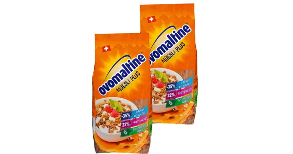Knusprige Cerealienmischung (52%), mit Proteincrispies (20%) und Ovomaltine* Das Ovomaltine Plus Müesli bietet ein ausgewogenes Frühstückserlebnis mit einer köstlichen Mischung aus Haferflocken und feinster Ovomaltine. Ideal für einen energiereichen Start in den Tag und ein guter Begleiter für alle, die einen aktiven Lebensstil pflegen. Geniessen Sie den bewährten Geschmack von Ovomaltine in einer praktischen Müesli-Form. – Zutaten: HAFERFLOCKEN, Proteincrispies (Erbsenprotein, WEIZENPROTEIN, Maniokstärke, WEIZENMEHL, fettarmes Kakaopulver), Zucker, Sonnenblumenöl, Ruchmehl (WEIZEN, ROGGEN), 6% malzhaltiges Getränkepulver** Ovomaltine [GERSTENMALZEXTRAKT, kondensierte MAGERMILCH, fettarmes Kakaopulver, Mineralstoffe (Dicalciumphosphat, Magnesiumcarbonat, Eisenpyrophosphat), Vitamine (A, D, E, K, C, Thiamin, Riboflavin, Niacin, B6, Folsäure, B12, Biotin, Pantothensäure), Speisesalz, Aroma Vanillin], Mineralstoffe (Tricalciumcitrat, Trimagnesiumcitrat,Eisenpyrophosphat), Kakaopulver, Speisesalz, Vitamine (D, E, K, C, Thiamin, Riboflavin, Niacin, B6, Folsäure, B12, Biotin, Pantothensäure), Aromen. Kann enthalten: Sesam, Soja, Dinkel, Mandeln, Cashewnüsse, Haselnüsse, Pecannüsse. Zutaten: HAFERFLOCKEN, Proteincrispies (Erbsenprotein, WEIZENPROTEIN, Maniokstärke, WEIZENMEHL, fettarmes Kakaopulver), Zucker, Sonnenblumenöl, Ruchmehl (WEIZEN, ROGGEN), 6% malzhaltiges Getränkepulver** Ovomaltine [GERSTENMALZEXTRAKT, kondensierte MAGERMILCH, fettarmes Kakaopulver, Mineralstoffe (Dicalciumphosphat, Magnesiumcarbonat, Eisenpyrophosphat), Vitamine (A, D, E, K, C, Thiamin, Riboflavin, Niacin, B6, Folsäure, B12, Biotin, Pantothensäure), Speisesalz, Aroma Vanillin], Mineralstoffe (Tricalciumcitrat, Trimagnesiumcitrat,Eisenpyrophosphat), Kakaopulver, Speisesalz, Vitamine (D, E, K, C, Thiamin, Riboflavin, Niacin, B6, Folsäure, B12, Biotin, Pantothensäure), Aromen. Kann enthalten: Sesam, Soja, Dinkel, Mandeln, Cashewnüsse, Haselnüsse, Pecannüsse.