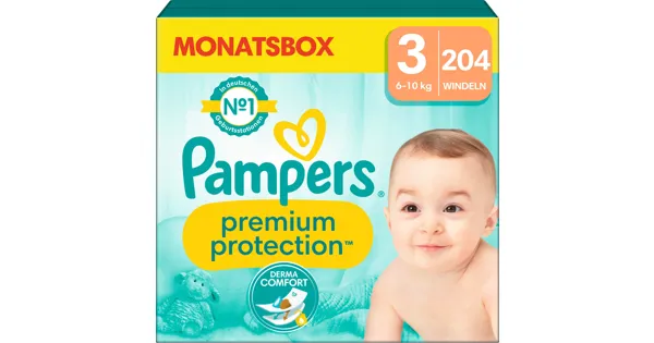 Komfort und Schutz von Pampers für empfindliche Babyhaut. Längerer Kontakt mit Urin und Stuhl kann die empfindliche Babyhaut reizen und so unangenehm für dein Baby werden. Pampers Premium Protection Windeln wurden speziell entwickelt, um den weichsten Komfort und Schutz von Pampers zu bieten:1) Das DERMACOMFORT Innenvlies mit saugfähigen Poren nimmt Feuchtigkeit und flüssigen Stuhl sofort auf und leitet sie weg von der Haut in den Windelkern. So bleibt die empfindliche Babyhaut trocken und geschützt.2) Millionen von Mikroporen lassen die Luft in der Windel zirkulieren und halten die Babyhaut trocken.3) Bis zu 100 % Auslaufschutz dank eines einzigartigen 3-fach-Schutz-Systems, das Flüssigkeit schnell absorbiert und vor Auslaufen an Bäuchlein und Beinchen schützt.4) Ultra weiche Materialien sorgen für Komfort und Schutz.Pampers Premium Protection Windeln – die Nr.1 in deutschen Geburtsstationen (basierend auf Januar 2023 Verteilungsdaten in Geburtsstationen in Deutschland) – sind 100 % sicher für die Babyhaut: sie sind dermatologisch getestet und frei von 26 EU-Parfümallergenen.
