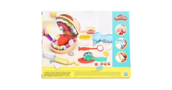 Zahnarzt Dr. Wackelzahn lädt zum Rollenspiel ein und führt die Kleinen spielerisch an das Thema Zahnarztbesuch heran. Hier streckt der Patient auf lustige Art die Zunge heraus und wartet geduldig darauf, behandelt zu werden. Mit der Zahnform entsteht im Nu eine ganze Zahnreihe aus Play-Doh und dann können die Zähne mit dem handbetriebenen Bohrer und der Knetspritze behandelt und mit Füllungen versehen werden. Mit Play-Doh „Kariesknete“ mit grünen Sprenkeln und gold- und silberfarbener Play-Doh für eine Zahnspange und Plomben geht es in der Zahnarztpraxis von Dr. Wackelzahn rund. Mit insgesamt 10 Zubehörteilen als Zahnarztinstrumente und 8 Dosen Play-Doh eignet sich dieses Zahnarzt-Set hervorragend, um den Kleinen die Angst vor dem nächsten Zahnarztbesuch zu nehmen. Hasbro, Play-Doh, and all related properties are trademarks of Hasbro.