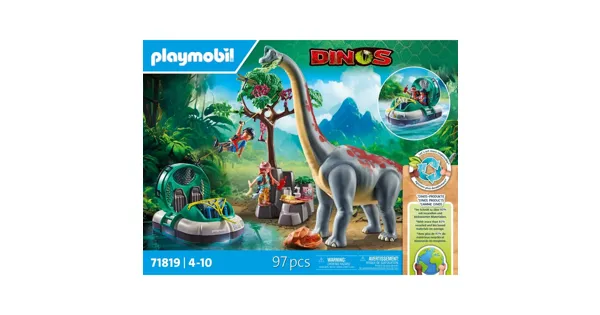 Das mutige Forscherteam nähert sich dem gigantischen Brachiosaurus mit ihrem schwimmfähigen Hovercraft. Während sich einer der Forscher wagemutig an der Zipline zum Baum schwingt, um den Brachiosaurus beim Fressen zu beobachten, bleibt die Forscherin aus sicherer Entfernung zurück. Sie konzentriert sich darauf, die Verhaltensmuster des Dinosauriers zu dokumentieren und nutzt dabei ihr fortschrittliches Equipment. Der Brachiosaurus, ausgestattet mit einem beweglichen Kiefer, zupft genüsslich die Blätter von den Bäumen. Inklusive Dino-Wissenskarte.