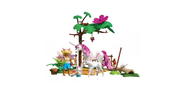 In diesem magischen Stall finden die Einhornmama und ihr niedliches Fohlen Schutz. Unter einem natürlichen Blätterdach versorgt die Fee liebevoll die Tiere – sie kühlt die Einhornmama mit einem...