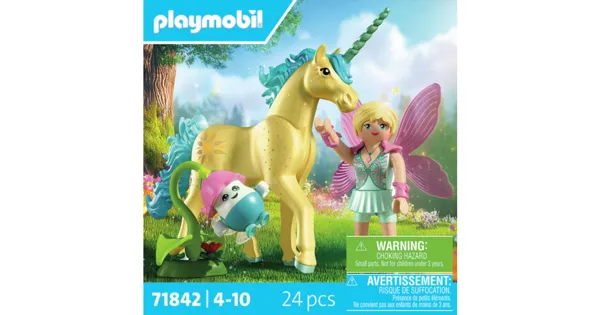 Lerne das Einhorn Sonnenscheinblüte und seine bezaubernde Feenfreundin kennen – mit ihrem sonnigen Wesen bringt sie jeden Tag zum Strahlen. Ihre unerschütterliche Zuversicht macht selbst schwierige Aufgaben leichter. Die Fee wird liebevoll von ihrem Joyling unterstützt, der bei der Pflege des Einhorns hilft. Mähne, Schweif und Horn sind austauschbar, wodurch individuelle Einhornkreationen mit weiteren Einhörnern der Serie möglich sind. Eigenschaften PLAYMOBIL Magic Unicorns 71842 strahlendes Sammeleinhorn mit fröhlicher Ausstrahlung austauschbare Mähne, Schweif und Horn inklusive Fee und Joyling für fantasievolle Pflegeszenen Made in Germany (PLAYMOBIL-Qualität) geeignet ab 4 Jahren Masse und Gewicht Packungsmasse: ca. 14,2 × 14,2 × 4,1 cm Produktmasse: ca. 39,0 × 15,1 × 15,6 cm Gewicht: ca. 100 g Lieferumfang 1 Fee (Frau), 1 Joyling 1 Einhorn Sonnenscheinblüte 1 Riesenblume, 2 Blüten 2 Flügel, 1 Flügelkragen, 2 Manschetten 1 Kinderhut, 1 kleines Flügelpaar