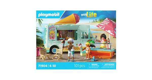 Lecker! Der Ice Cream Truck mit vielen leckeren Eissorten ist da. Das kleine Mädchen hat ihn schon von weitem an der grossen Eiswaffel auf dem Dach erkannt. Im klassischen 50er-Jahre-Retrolook bringt er Freude und Nostalgie an den Strand. Auf den Klappstühlen unter dem Sonnenschirm können die kleinen Schleckermäuler gemütlich Platz nehmen. Die Eisverkäuferin baut ihren Verkaufsstand im Aussenbereich auf, während im Inneren Surfbretter und buntes Wassersportequipment bereitstehen. Mit dem PLAYMOBIL Eiswagen mit Surfshop kommt Farbe, Spass und Urlaubsstimmung an den Strand. Das Fahrzeug im Retro-Look überzeugt mit abnehmbarem Dach, aufklappbarer Seitenwand und drehbarem Eisschild. Kinder können Eis servieren oder Surfbretter und Schnorchelausrüstung vermieten. Innen gibt es einen liebevoll gestalteten Verkaufsbereich mit herausnehmbarer Theke, Eishaltern und Regalflächen. Dieses farbenfrohe Set sorgt für kreativen Sommerspass am Strand – ideal für kleine Geniesser und Abenteurer. Details: Figuren: 1 Frau, 1 Mann mit Kappe, 1 Mädchen Tiere: 1 Vogel Zubehör: 1 Truck mit grosser Eiswaffel auf dem Dach, 1 Eistheke (Erdbeer-, Schokoladen- und Vanilleeis), 1 Glas mit Deckel, 1 Tube, 1 Trinkbecher mit Strohhalm, 2 Eiswaffeln mit steckbaren Eiskugeln, 1 Surfbrett, 1 Paddel, 2 Schwimmflossen, 2 Taucherbrillen mit Schnorchel, 3 Boxen mit Obst, 1 Sonnenschirm, 2 Klappstühle, 1 Papierkorb, 1 Spielsegelboot, 1 Eiskugelportionierer Warnhinweis: Nicht geeignet für Kinder unter 36 Monaten – Erstickungsgefahr durch Kleinteile.