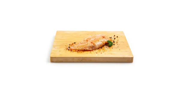Pouletfleischzubereitung mariniert – Zutaten: Pouletfleisch (Schweiz), Pflanzenöle (Raps, Raps ganz gehärtet), Apfelwein (enthält Antioxidationsmittel ]), Speisesalz jodiert, Apfelsaft, Gewürze,...