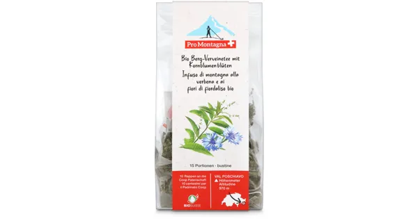Kräuterteemischung Pro Montagna steht für authentische und qualitativ hochstehende Spezialitäten aus den Schweizer Bergen. So gönnen Sie sich etwas Gutes und unterstützen die Menschen im Berggebiet gleich doppelt: Pro Montagna Produkte schaffen Absatz und mit jedem Kauf fliesst ein Beitrag an die Patenschaft für Berggebiete für dringend notwendige Projekte im Berggebiet (siehe Beitragshöhe unter Eigenschaften). – Zutaten: Wohlriechendes Eisenkraut* (Schweiz), Kornblumen* 3% (Schweiz). Alle landwirtschaftlichen Zutaten stammen aus biologischer Produktion. *aus Berggebiet. Zutaten: Wohlriechendes Eisenkraut* (Schweiz), Kornblumen* 3% (Schweiz). Alle landwirtschaftlichen Zutaten stammen aus biologischer Produktion. *aus Berggebiet.