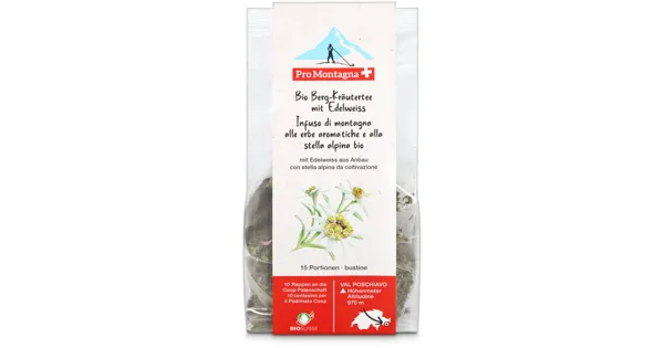 Kräuterteemischung Pro Montagna steht für authentische und qualitativ hochstehende Spezialitäten aus den Schweizer Bergen. So gönnen Sie sich etwas Gutes und unterstützen die Menschen im Berggebiet gleich doppelt: Pro Montagna Produkte schaffen Absatz und mit jedem Kauf fliesst ein Beitrag an die Patenschaft für Berggebiete für dringend notwendige Projekte im Berggebiet (siehe Beitragshöhe unter Eigenschaften). – Zutaten: Pfefferminze* (Schweiz), Apfelminze* (Schweiz), Zitronenmelisse* (Schweiz), Orangenminze* (Schweiz), Kornblumen* (rosa, rot [Schweiz]), Edelweiss* 3% (Schweiz). Alle landwirtschaftlichen Zutaten stammen aus biologischer Produktion. *aus Berggebiet. Zutaten: Pfefferminze* (Schweiz), Apfelminze* (Schweiz), Zitronenmelisse* (Schweiz), Orangenminze* (Schweiz), Kornblumen* (rosa, rot [Schweiz]), Edelweiss* 3% (Schweiz). Alle landwirtschaftlichen Zutaten stammen aus biologischer Produktion. *aus Berggebiet.