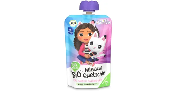 Bio Fruchtpüree mit Vollkorn-Hafer – Zutaten: Apfelpüree* 70%, Mangopüree* 20%, Wasser, Vollkorn-HAFERmehl* 2%. *aus biologischer Landwirtschaft. Zutaten: Apfelpüree* 70%, Mangopüree* 20%, Wasser, Vollkorn-HAFERmehl* 2%. *aus biologischer Landwirtschaft.