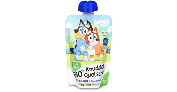 Aktion Bio Fruchtpüree aus Apfel, Blaubeere & Vollkorn-Hafer – Zutaten: Apfelpüree* 75%, Blaubeerpüree* 15%, Wasser, Vollkorn-HAFERmehl* 2%. *aus biologischer Landwirtschaft. Zutaten: Apfelpüree*...