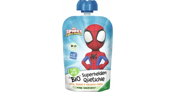 Bio Fruchtpüree aus Apfel und Banane mit Vollkorndinkel – Zutaten: Apfelpüree* (67%), Bananenpüree* (20%), Wasser, DINKELvollkornmehl* (3,0%). *aus biologischer Landwirtschaft. Zutaten: Apfelpüree* (67%), Bananenpüree* (20%), Wasser, DINKELvollkornmehl* (3,0%). *aus biologischer Landwirtschaft.