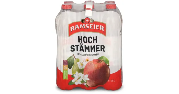 Obstsaft naturtrüb Ramseier Hochstämmer 6x1.5l. Obstsaft. Naturtrüb. Ohne Kohlensäure. Pasteurisiert. Garantiert durch Hochstamm Suisse mit unabhängigen Kontrollen. – Zutaten: Schweizer Apfelsaft (75%) und Schweizer Birnensaft (25%) aus Konzentrat. Pasteurisiert. Vegan. Zutaten: Schweizer Apfelsaft (75%) und Schweizer Birnensaft (25%) aus Konzentrat. Pasteurisiert. Vegan.