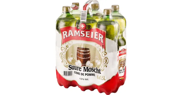 Apfelwein teilvergoren Ramseier Suure Moscht. 4.0% Vol. 6x1.5l. – Zutaten: Schweizer Apfelsaft (max. 10% Birnensaft) aus Konzentrat teilvergoren, Kohlensäure, Antioxidationsmittel...