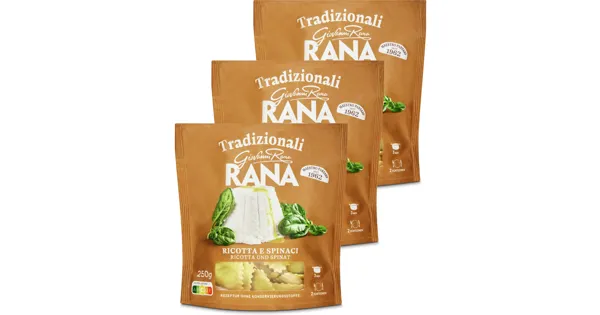 Frische Eierteigwaren mit einer Füllung aus Spinat und Ricotta Frische Eierteigwaren mit einer Füllung aus Ricotta und Spinat. Unter Schutzatmosphäre verpackt. Seit 50Jahren stelle ich meine frische Pasta mit Leidenschaft her. Die sorgfältig ausgewählten Zutaten und die traditionellen Rezepturen lassen Sie den echten italienischen Geschmack geniessen - Giovanni Rana. – Zutaten: Füllung 53%: Ricotta 35% (MOLKE, MILCH, SAHNE, Kochsalz), Spinat 20%, Pflanzenfasern, Sonnenblumenöl, Paniermehl (WeichWEIZENmehl, Wasser, Kochsalz, Hefe), MOLKENpulver, Stärken, Mascarpone KÄSE, natürliche Aromen (enthalten MILCH und WEIZEN), Kochsalz, Kartoffelflocken, Knoblauch, Muskatnuss. Teigwaren 47%: WeichWEIZENmehl, EIER 30%, HartWEIZENgriess Allergene: siehe Zutaten in Fettschrift. Hergestellt in einem Werk, das auch KREBSTIERE, FISCHE, SCHALENFRÜCHTE, SELLERIE und WEICHTIERE verwendet. Zutaten: Füllung 53%: Ricotta 35% (MOLKE, MILCH, SAHNE, Kochsalz), Spinat 20%, Pflanzenfasern, Sonnenblumenöl, Paniermehl (WeichWEIZENmehl, Wasser, Kochsalz, Hefe), MOLKENpulver, Stärken, Mascarpone KÄSE, natürliche Aromen (enthalten MILCH und WEIZEN), Kochsalz, Kartoffelflocken, Knoblauch, Muskatnuss. Teigwaren 47%: WeichWEIZENmehl, EIER 30%, HartWEIZENgriess Allergene: siehe Zutaten in Fettschrift. Hergestellt in einem Werk, das auch KREBSTIERE, FISCHE, SCHALENFRÜCHTE, SELLERIE und WEICHTIERE verwendet.