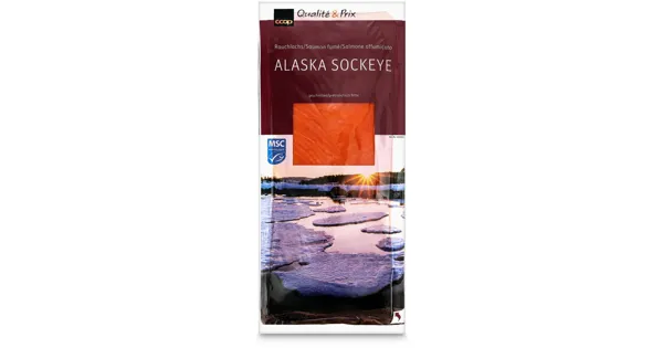 Rotlachs (Oncorhynchus nerka) geräuchert, geschnitten – Zutaten: ROTLACHS (gefangen im Nordostpazifik, Kiemennetze und vergleichbare Netze [Stellnetze-Kiemennetze]), Meersalz. Zutaten: ROTLACHS (gefangen im Nordostpazifik, Kiemennetze und vergleichbare Netze [Stellnetze-Kiemennetze]), Meersalz.