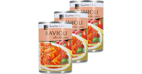 Eierravioli mit 30% Rindfleischfüllung an 73% Rindfleischsauce Entdecken Sie den köstlichen Geschmack von Ravioli alla Bolognese. Diese haltbare Convenience-Beilage überzeugt mit einer herzhaften Füllung aus hochwertigem Rindfleisch und aromatischen Tomaten. Dank des guten Preis-Leistungsverhältnisses eignet sich Ravioli alla Bolognese perfekt für eine schnelle und unkomplizierte Mahlzeit. – Zutaten: Wasser, HARTWEIZENGRIESS, Rindfleisch 10% (Schweiz), Tomatenmarkkonzentrat 6%, Rotwein, WEIZENMEHL, EIER* 1.5%, Karotten, Rapsöl, Gewürze, Kochsalz, aufgeschlossenes SOJAPROTEIN, aufgeschlossenes WEIZENPROTEIN, Aroma (enthält WEIZEN), Wachsmaisstärke, Kochsalz jodiert, Hefe. *Mit Eiern aus Freilandhaltung. Zutaten: Wasser, HARTWEIZENGRIESS, Rindfleisch 10% (Schweiz), Tomatenmarkkonzentrat 6%, Rotwein, WEIZENMEHL, EIER* 1.5%, Karotten, Rapsöl, Gewürze, Kochsalz, aufgeschlossenes SOJAPROTEIN, aufgeschlossenes WEIZENPROTEIN, Aroma (enthält WEIZEN), Wachsmaisstärke, Kochsalz jodiert, Hefe. *Mit Eiern aus Freilandhaltung.
