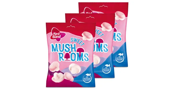 Schaumzuckerbonbons mit Himbeergeschmack Red Band Sweet mushrooms 3x140g – Zutaten: Glukosesirup, Zucker, Invertzuckersirup, Gelatine, Maltodextrin, pflanzliche Öle (Palm, Kokos), Säuerungsmittel...