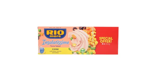 Fertiggericht mit Gemüse und Thunfisch Der Rio mare Insalatissime Thunfischsalat mit Mais bietet eine köstliche Kombination aus hochwertigem Thunfisch und knackigem Mais. Ideal für eine schnelle und nahrhafte Mahlzeit unterwegs oder zu Hause. Dieser haltbare Salat ist eine praktische und schmackhafte Option für jeden Tag. – Zutaten: Mais 31%, THUNFISCH** 23%, Maissamenöl 12%, Karotten 12%, grüne Erbsen 12%, schwarze Oliven 4%, Zitronensaft, Salz. **Echter Bonito, Katsuwonus Pelamis. Zutaten: Mais 31%, THUNFISCH** 23%, Maissamenöl 12%, Karotten 12%, grüne Erbsen 12%, schwarze Oliven 4%, Zitronensaft, Salz. **Echter Bonito, Katsuwonus Pelamis.