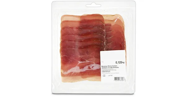 Schweinefleischerzeugnis gepökelt – Zutaten: Schweinefleisch (Schweiz), Kochsalz jodiert, Glucose, Gewürze, Antioxidationsmittel (E 301, E 331), Konservierungsstoff (E 252), Gewürzextrakte. Zutaten: Schweinefleisch (Schweiz), Kochsalz jodiert, Glucose, Gewürze, Antioxidationsmittel (E 301, E 331), Konservierungsstoff (E 252), Gewürzextrakte.