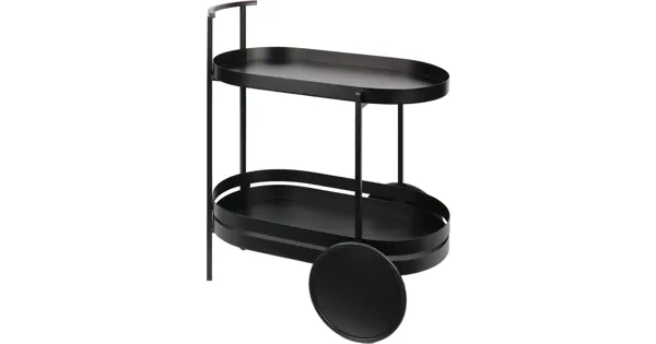 Dieser elegante, ovale Rollwagen aus schwarzem Metall mit zwei praktischen Ablagen verleiht deinem Zuhause eine stilvolle Note. Dank seiner kompakten Abmessungen von 60 x 70 x 33 cm passt er perfekt in jede Ecke und sorgt für Ordnung mit Stil. Ob als schicke Tee-Bar, mobiler Beistelltisch oder dekoratives Highlight – er ist vielseitig einsetzbar.
