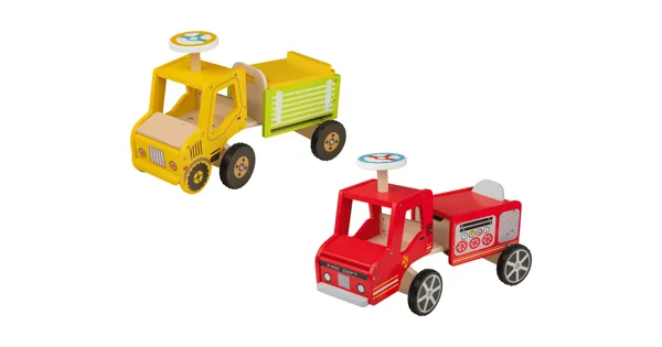 Leichte Lenkung ermöglicht eine einfache Steuerung , Zusätzlicher Stauraum unter dem Sitz , Masse roter Truck (B x H x T): ca. 57 x 38 x 27 cm , Masse gelber Truck (B x H x T): ca. 58 x 38 x 87 cm , Pro Stück