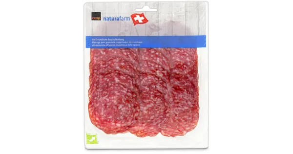 Fleischerzeugnis aus Schweine- und Rindfleisch – Zutaten: pro 100 g: Schweinefleisch 95 g (Schweiz), Speck (Schweiz), Rindfleisch 18 g (Schweiz), Nitritpökelsalz (Kochsalz, Konservierungsstoff [E 250]), Kochsalz jodiert, Glucose, Gewürze, Aroma, Antioxidationsmittel (E 300, E 301), Konservierungsstoff (E 252), Gewürzextrakte. Zutaten: pro 100 g: Schweinefleisch 95 g (Schweiz), Speck (Schweiz), Rindfleisch 18 g (Schweiz), Nitritpökelsalz (Kochsalz, Konservierungsstoff [E 250]), Kochsalz jodiert, Glucose, Gewürze, Aroma, Antioxidationsmittel (E 300, E 301), Konservierungsstoff (E 252), Gewürzextrakte.