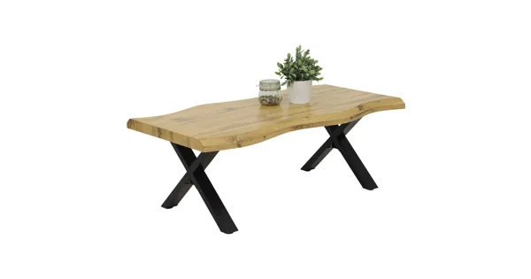 Der Salontisch Pina aus pflegeleichtem MDF ist ein echter Blickfang im Wohnzimmer und verleiht dem Raum Flair. Sein einzigartiges Design mit Baumkantenoptik in Kombination mit dem schwarzen, pulverbeschichteten X-Gestell fügt sich gekonnt in deine bestehende Einrichtung ein. Der Wohnzimmertisch eignet sich perfekt für Zeitschriften, Fernbedienungen, Deko, Bücher oder den morgendlichen Kaffee.