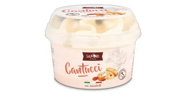 Aktion Rahmglace mit Mandeln und Dauerbackware "Cantucci" – Zutaten: MILCH, RAHM 12%, MANDELN 8%, Glucosesirup, Zucker, Dauerbackware "Cantucci" 6% (WEIZENMEHL, Zucker, MANDELN 1,4%, EIER, BUTTER,...