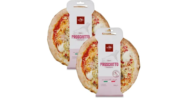 Pizza belegt mit Schinken, Pilzen und Käse, aufgetaut Die Sapori d'Italia Pizza Prosciutto & Mascarpone bietet ein harmonisches Zusammenspiel von zartem Prosciutto und cremigem Mascarpone. Diese gekühlte Frische-Convenience-Pizza überzeugt durch ihre sorgfältig ausgewählten Zutaten und authentischen italienischen Geschmack. Ideal für ein schnelles und genussvolles Essen zu Hause. – Zutaten: WEIZENMEHL, Käse 20% (Mozzarella 13% [MILCH, Kochsalz], MASCARPONE 7% [mit Säureregulator [E 330]]), Wasser, Tomatenpulpe, Schinken9% (Schweinefleisch, Wasser, Nitritpökelsalz [Kochsalz, Konservierungsstoff [E 250]], Kartoffelstärke, Zucker, Glucose, Gewürze, Gewürzextrakte, Antioxidationsmittel [E 301]), Champignons 9% (Champignons, Sonnenblumenöl, Kochsalz, Zucker, Knoblauch, Säureregulator [E 270]), HARTWEIZENGRIESS, Kochsalz, Olivenöl, Hefe, Oregano. Zutaten: WEIZENMEHL, Käse 20% (Mozzarella 13% [MILCH, Kochsalz], MASCARPONE 7% [mit Säureregulator [E 330]]), Wasser, Tomatenpulpe, Schinken9% (Schweinefleisch, Wasser, Nitritpökelsalz [Kochsalz, Konservierungsstoff [E 250]], Kartoffelstärke, Zucker, Glucose, Gewürze, Gewürzextrakte, Antioxidationsmittel [E 301]), Champignons 9% (Champignons, Sonnenblumenöl, Kochsalz, Zucker, Knoblauch, Säureregulator [E 270]), HARTWEIZENGRIESS, Kochsalz, Olivenöl, Hefe, Oregano.