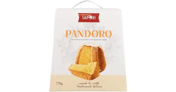 Feinbackware – Zutaten: Pandoro 750g: WEIZENMEHL, Zucker, BUTTER, EIGELB, EIER, getrockneter Sauerteig (WEIZEN), Kakaobutter, Hefe, MAGERMILCHPULVER, Emulgator (E 471), Ethanol, WEIZENGLUTEN,...