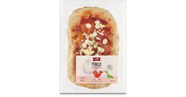 Pinsa belegt mit Tomaten und Mozzarella, aufgetaut – Zutaten: Wasser, WEIZENMEHL, Tomatenpulpe 20%, WEIZENRUCHMEHL, Mozzarella 7% (MILCH, Kochsalz), Mozzarellaperlen 7% (MILCH, Kochsalz, Säureregulator [E 330]), Sauerteig getrocknet (WEIZENMEHL, REISMEHL), Tomatenzubereitung (rehydrierte getrocknete Tomaten 2%, Sonnenblumenöl, Weinessig, Kochsalz, Petersilie, Knoblauch, Oregano, Säureregulatoren [E 330, E 270], Antioxidationsmittel [E 300]), HARTWEIZENGRIESS, Sonnenblumenöl, Kochsalz, Hefe, gemälztes WEIZENMEHL. Kann Spuren von DINKEL, GERSTE, HAFER, KHORASAN-WEIZEN, ROGGEN, SENF, SOJA enthalten. Zutaten: Wasser, WEIZENMEHL, Tomatenpulpe 20%, WEIZENRUCHMEHL, Mozzarella 7% (MILCH, Kochsalz), Mozzarellaperlen 7% (MILCH, Kochsalz, Säureregulator [E 330]), Sauerteig getrocknet (WEIZENMEHL, REISMEHL), Tomatenzubereitung (rehydrierte getrocknete Tomaten 2%, Sonnenblumenöl, Weinessig, Kochsalz, Petersilie, Knoblauch, Oregano, Säureregulatoren [E 330, E 270], Antioxidationsmittel [E 300]), HARTWEIZENGRIESS, Sonnenblumenöl, Kochsalz, Hefe, gemälztes WEIZENMEHL. Kann Spuren von DINKEL, GERSTE, HAFER, KHORASAN-WEIZEN, ROGGEN, SENF, SOJA enthalten.