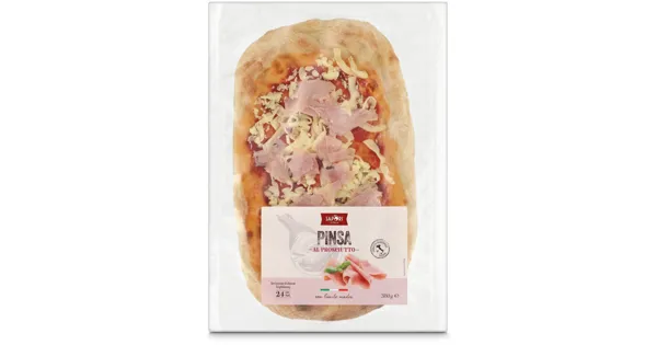 Pinsa belegt mit Schinken, aufgetaut – Zutaten: Wasser, WEIZENMEHL, Tomatenpulpe, WEIZENRUCHMEHL, Mozzarella 8% (MILCH, Kochsalz), Schinken 6% (Schweinefleisch, Wasser, Nitritpökelsalz [Kochsalz, Konservierungsstoff [E 250]], Stärke, Zucker, Glucose, Gewürze, Gewürzextrakte, Antioxidationsmittel [E 301]), Sauerteig getrocknet (WEIZENMEHL, REISMEHL), HARTWEIZENGRIESS, Sonnenblumenöl, Kochsalz, Hefe, gemälztes WEIZENMEHL. Kann Spuren von DINKEL, GERSTE, HAFER, KHORASAN-WEIZEN, ROGGEN, SENF, SOJA enthalten. Zutaten: Wasser, WEIZENMEHL, Tomatenpulpe, WEIZENRUCHMEHL, Mozzarella 8% (MILCH, Kochsalz), Schinken 6% (Schweinefleisch, Wasser, Nitritpökelsalz [Kochsalz, Konservierungsstoff [E 250]], Stärke, Zucker, Glucose, Gewürze, Gewürzextrakte, Antioxidationsmittel [E 301]), Sauerteig getrocknet (WEIZENMEHL, REISMEHL), HARTWEIZENGRIESS, Sonnenblumenöl, Kochsalz, Hefe, gemälztes WEIZENMEHL. Kann Spuren von DINKEL, GERSTE, HAFER, KHORASAN-WEIZEN, ROGGEN, SENF, SOJA enthalten.