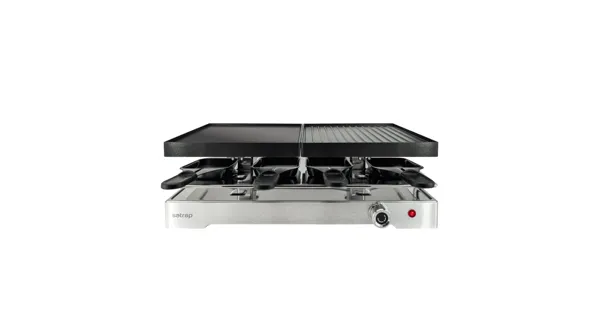 Das hochwertige satrap Raclettegerät Zermatt 8.0 ist ideal für gesellige Abende mit bis zu acht Personen und überzeugt mit einer vielseitigen Grillplattenoberfläche, perfekt für Fisch, Fleisch, Gemüse und Obst. Dank der praktischen Kaltzone können Pfännchen bequem abgestellt werden, ohne den Tisch zu überladen. Nach Gebrauch lässt sich das Gerät mühelos in der mitgelieferten Aufbewahrungstasche verstauen.
