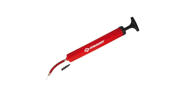 Freizeit-Ballpumpe aus rot-schwarzem Kunststoff. Pumpt jeden Fuss-/ Volley-/ Foot- oder Basketball auf. Jedoch am liebsten die coolen Neoprenbälle von Schildkröt. Sicherer Halt durch den Griff und die etwas längere Bauweise. Inklusive Luftschlauch und 2 Ventilnadeln aus Metall zum Aufschrauben. Im wiederverschliessbaren Polybag mit Druckknopf. Die über 100 Jahre alte deutsche Marke Schildkröt gilt als Erfinder des Tischtennisballs. Heute bietet Schildkröt neben Tischtennis auch eine sehr umfangreiche Funsport- und Beachsport-Kollektion an und gilt als Marktführer in diesem Bereich.