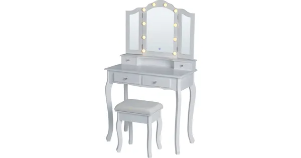 Der hübsche Schminktisch Lea lässt das weibliche Herz höherschlagen. Auf dem bequemen Hocker lassen sich Make-up und Frisur gemütlich im Sitzen schick zurechtmachen. Zusätzlich besitzt der Schminktisch LED-Beleuchtung mit Touchdimmer.